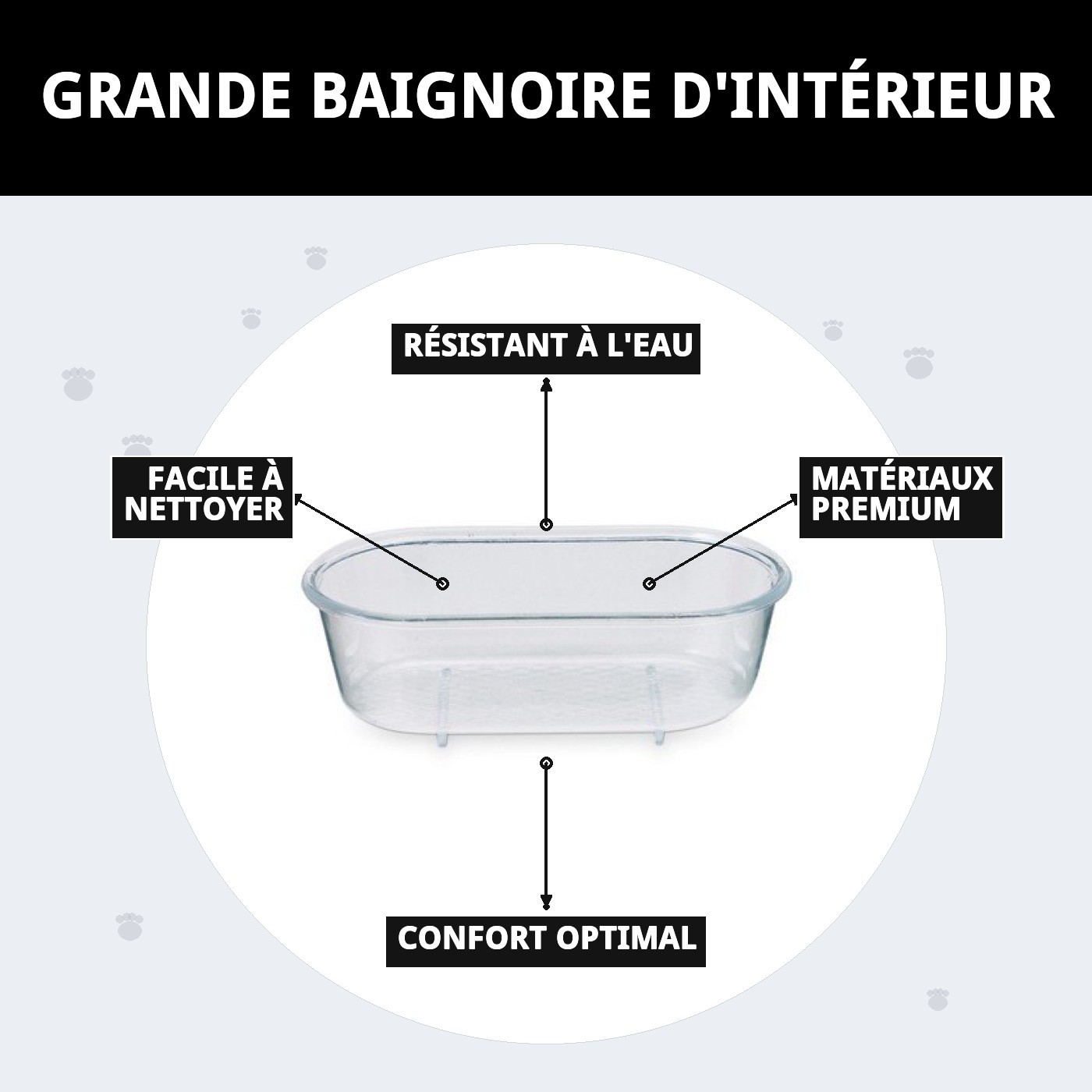 La grande baignoire intérieure est conçue en pensant au confort de votre animal et au vôtre. Sa taille spacieuse permet à des animaux de différentes races et tailles de se sentir à l'aise pendant le bain. De plus, sa structure est robuste et résistante, garantissant qu'elle ne se renverse pas et ne s'endommage pas facilement. La surface antidérapante assure que votre compagnon à fourrure ne glisse pas pendant qu'il s'amuse dans l'eau.