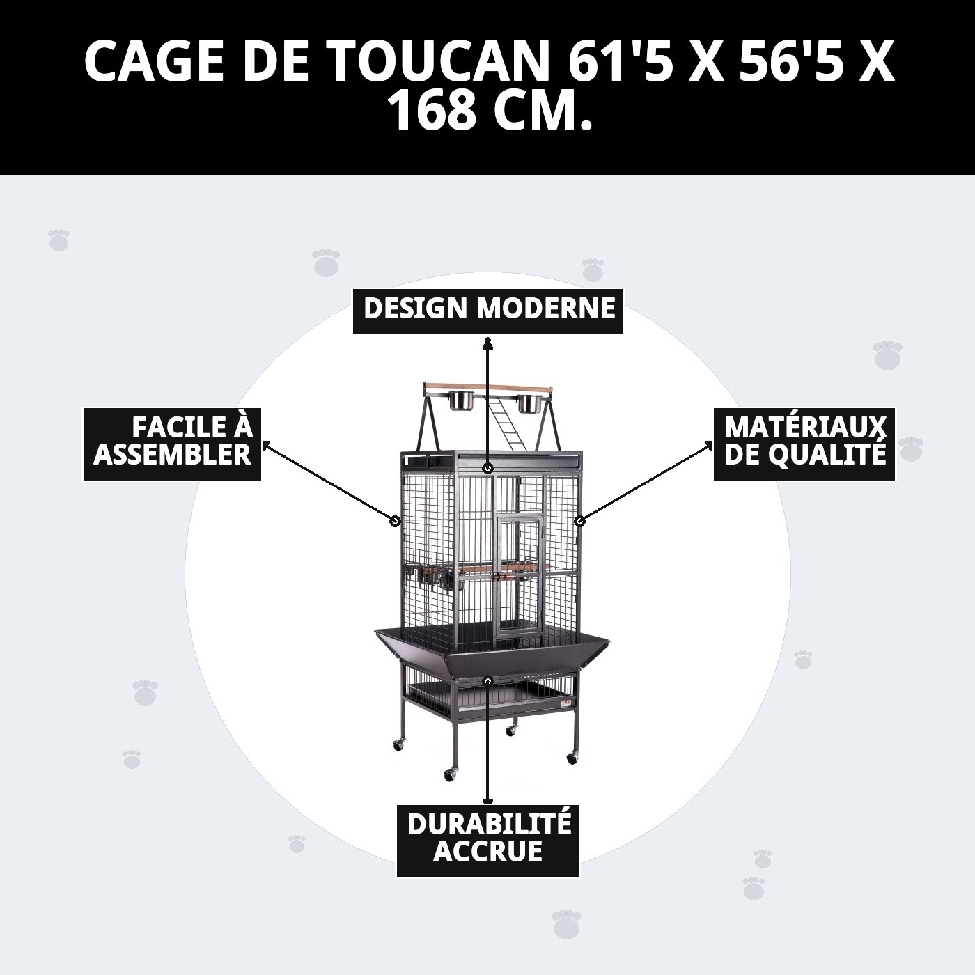 L'une des caractéristiques les plus remarquables de la cage tucan est sa taille généreuse. Avec des dimensions de 61.5 cm de large, 56.5 cm de profondeur et 168 cm de hauteur, elle offre un environnement spacieux où votre oiseau pourra se déplacer librement. Cela est particulièrement important pour les oiseaux qui ont besoin d'espace pour voler et jouer. De plus, la hauteur de la cage permet de placer des perchoirs et des jouets à différents niveaux, ce qui ajoutera variété et stimulation à leur quotidien.